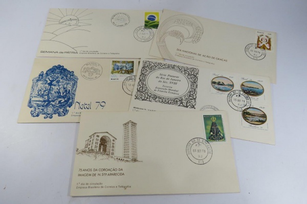 • FILATELIA  01 - LOTE com 05 (cinco) ENVELOPES do Primeiro dia de Circulação, de 1979. São eles: Semana da Pátria, Série Pinturas do Rio de Janeiro, Dia Nacional de Ação de Graças, Natal de 1979 e 75 Anos da Coroação da Imagem de Nossa Senhora Aparecida. Todos envelopes são numerados no verso.