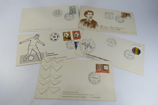 • FILATELIA  02 - LOTE com 05 (cinco) ENVELOPES do Primeiro dia de Circulação, de 1978. São eles: Homenagem ao Presidente Geisel, homenagem à Tosca de Carlos Gomes - bicentenário do Scala de Milão, XI Campeonato Mundial de Futebol, Luta contra a Hipertensão e Criação da ESAP (Escola Superior de Administração Postal). Todos envelopes são numerados no verso.
