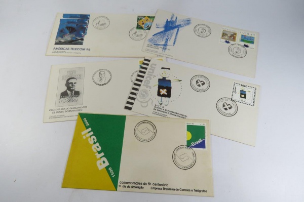• FILATELIA  03 - LOTE com 05 (cinco) ENVELOPES do Primeiro dia de Circulação, de 1996. São eles: Brasil 500 anos Comemorações do 5º Centenário; Amérias Telecom 96; Série Artes Plásticas Brasileiras; Luta Contra a Exploração Sexual de Crianças e Adolescentes e Centenário de Nascimento de Irineu Bornhausen. Os três últimos numerados no verso.