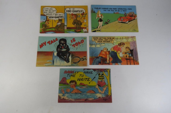 • POSTAIS ENGRAÇADOS - Lote com 05 (cinco) Cartões Postais, fabricados nos Estados Unidos, contendo cenas engraçadas. Dois deles enviados em 1946, um em 1947e dois em 1948 - todos selados e enviados.