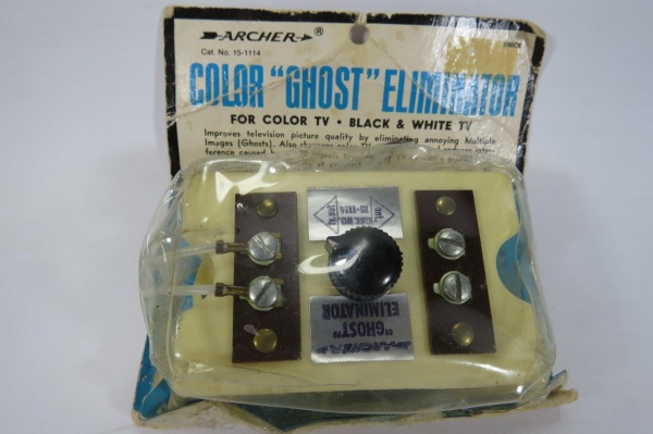 • CURIOSIDADE - ANTIGO EQUIPAMENTO denominado GHOST ELIMINATOR, fabricado nos Estados Unidos, marca ARCHER. Servia para eliminar fantasmas nas imagens, muito comuns em transmissões com a utilização de antena de TV. Funcionava tanto em transmissões colorias como em preto e branco. Tal equipamento ficou totalmente obsoleto em razão das transmissões digitais de TV. Apresenta a embalagem original deslacrada. Ideal para saudosistas e colecionadores de aparelhos de Televisão.