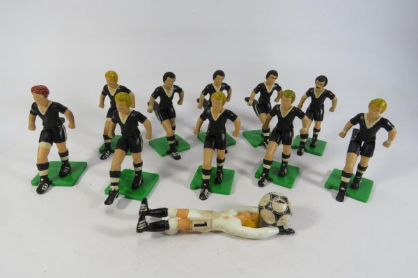 • COLECIONISMO - TIME DE FUTEBOL - Uniforme preto, da série Futebol Pelé Da Gulliver. Em todas as bases na cor verde estão gravados PELÉ. São 10 jogadores, 01 Goleiro e 01 Bola. Ausência da Haste / Vareta do Goleiro. Não temos a caixa - somente os jogadores - todos operacionais.