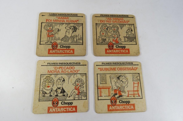 • COLECIONISMO - Lote com 04 (quatro) antigas BOLACHAS da Cerveja ANTARCTICA - Temas de filmes que marcaram época (Os filmes: De Rependet no Último Verão; As Minas do Rei Salomão; No Balanço das Horas; Amar Foi Minha Ruína; O Pecado mora ao Lado; Guerra e Paz; Sublime Obsessão e Os Pássaros). São dois filmes em cada Bolacha (frente e verso).