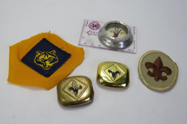 • COLECIONISMO - LOTE com Itens de ESCOTISMO (ESCOTEIRO), Composto por uma BÚSSOLA em Metal / RÉGUA em Plástico (Boy Scouts of América), Dois emblemas Metálicos e Dois emblemas em tecido. No total são 05 (cinco) peças.