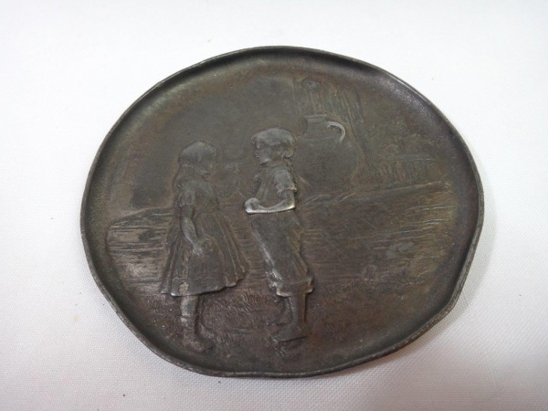 • COLECIONISMO - ANTIGO PORTA-CARTÕES EM METAL COM AS FIGURAS DE DUAS CRIANÇAS - PEÇA NUMERADA NO VERSO (328). Mede aprox. 11,5 cm de diâmetro. Necessita polimento caso o comprador assim o queira.