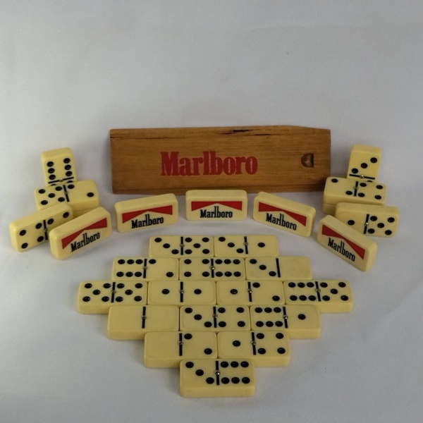 • Maravilhoso e antigo jogo de dominó com tema do Cigarro Marlboro - com 28 peças e a tampa da caixa de madeira original (não contém a caixa)