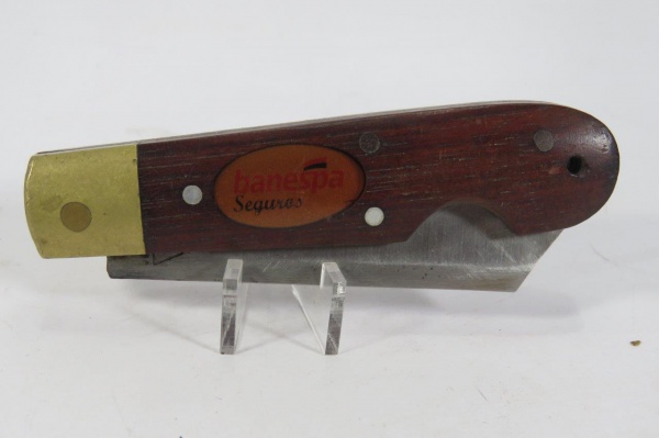 • CUTELARIA - CANIVETE ZEBU - Promocional do BANCO BANESPA SEGUROS. Apresenta marcas de ter sido afiado. Aberto mede aprox. 15,5 cm. Fechado mede aprox. 8,7 cm.
