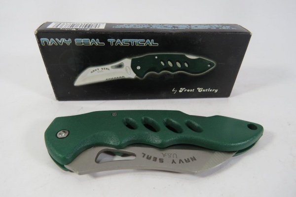 • CUTELARIA - CANIVETE NAVY SEAL TACTICAL / Frost Cutlery, na caixa original - na Cor Verde. Fechado mede aprox. 11,5 cm. Aberto mede aprox. 19 cm. Fabricado na China.