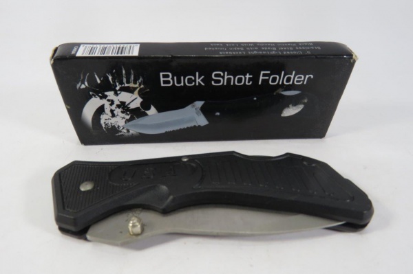 • CUTELARIA - CANIVETE BUCK SHOT FOLDER, na caixa original. Fechado mede aprox. 12,5 cm. Aberto mede aprox. 21 cm. Fabricado na China.