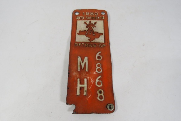 • COLECIONISMO - ANTIGA PLAQUETA de Licenciamento de Automóveis de São Paulo, datada de 1980 comemorativa da AUTO-SUFICIÊNCIA. Apresenta amassados na Lata, e dano no encaixe do lado inferior esquerdo (vide foto correspondente).