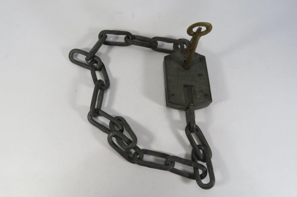• COLECIONISMO - ANTIGO CADEADO com CORRENTE. Sem marca do fabricante. Acompanha 01 chave.