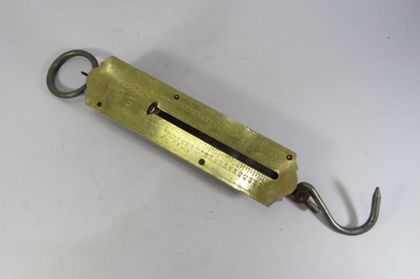 • COLECIONISMO - ANTIGA BALANÇA DE MÃO para sacarias. Não consta o fabricante. Pesa em Quilos e Libras (50 quilos / 112 Libras). Esticada (com os ganchos), mede aprox. 31 cm.