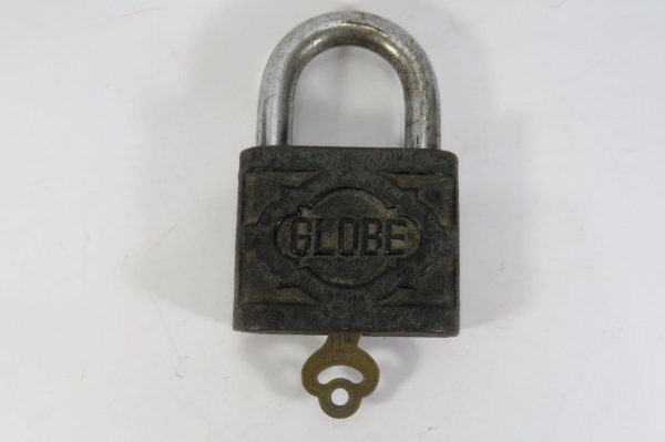 • COLECIONISMO - ROBUSTO e ANTIGO CADEADO marca GLOBE, com chave original. Fechado, mede aprox. 11,5 cm de altura.