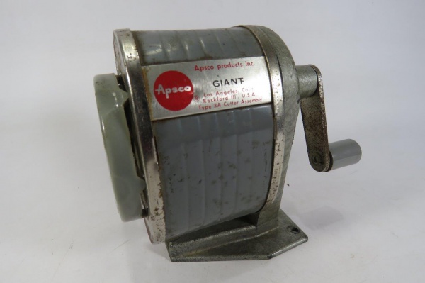 • COLECIONISMO - ANTIGO APONTADOR DE LÁPIS de mesa, manual, marca APSCO - Los Angeles - USA, bem conservado e funcionando. Para várias medidas.