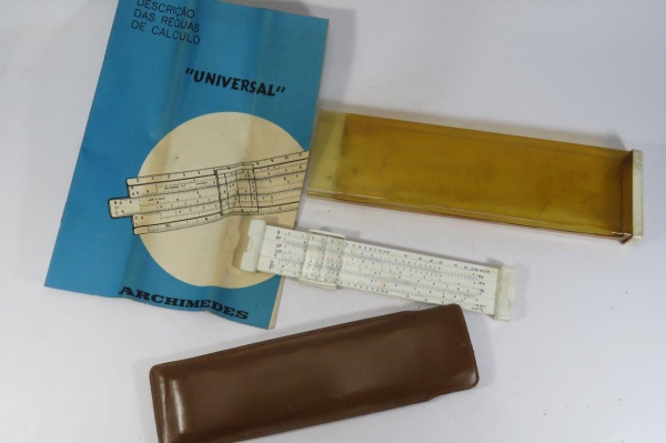• COLECIONISMO - ANTIGA RÉGUA DE CÁLCULO marca Arquimedes - Rio de Janeiro, na Embalagem original com danos no plástico protetor e ausência da tampa de um dos lados. Acompanha estojo protetor e Manual de Instruções.