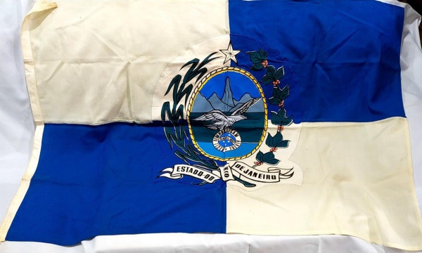 • COLECIONISMO - ANTIGA BANDEIRA DO ESTADO do RIO DE JANEIRO dupla face, com o emblema costurado. Mede aprox. 136 x 87 cm.